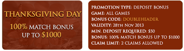 On popular demand we are back with DOUBLEHEADER to celebrate Thanksgiving Day. Claim 100% Match Bonus up to $1000 this Thursday on Thanksgiving Day. You can claim it twice in a day. Once again the playthrough ratio of this stunning Bonus Offer is only 45X. No limits on what you can withdraw, valid with deposits of as little as $50, all the way up to $1,000 & Use it on over 130 Games.